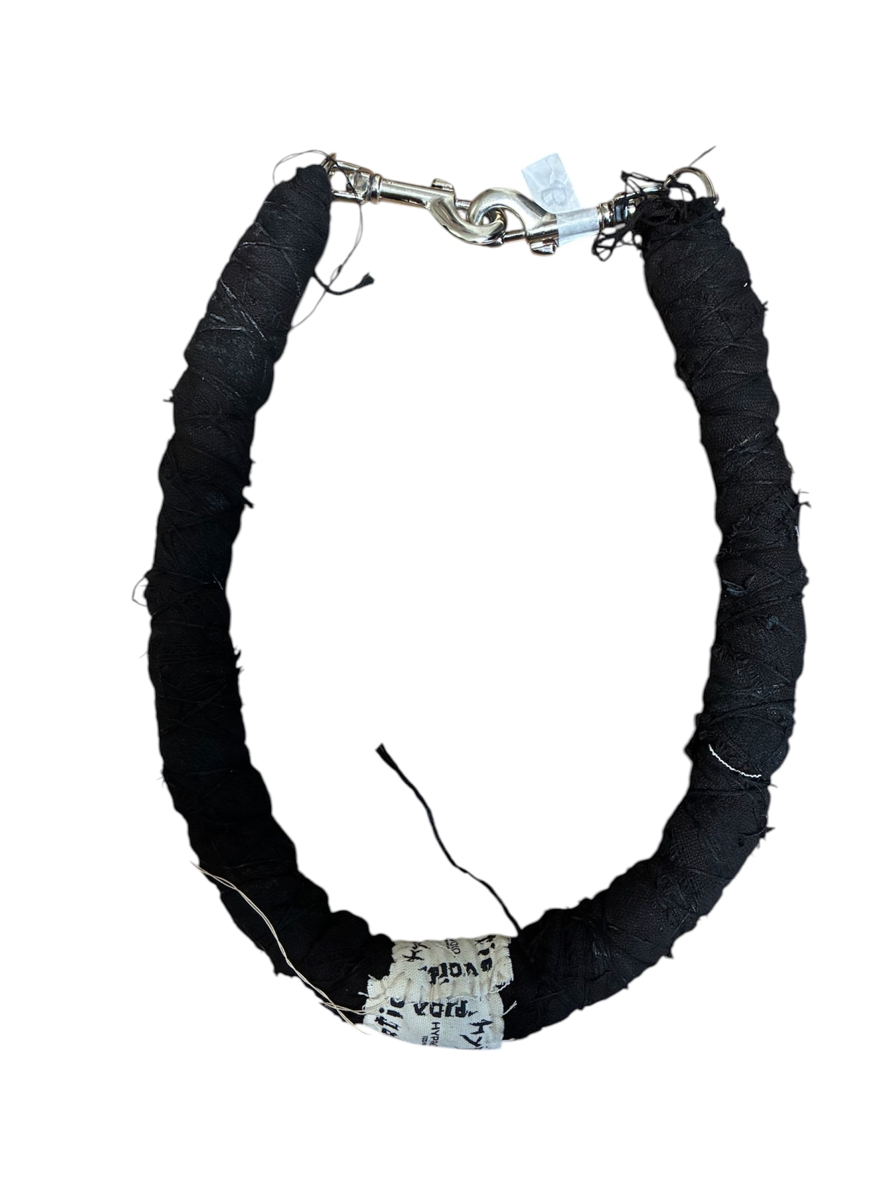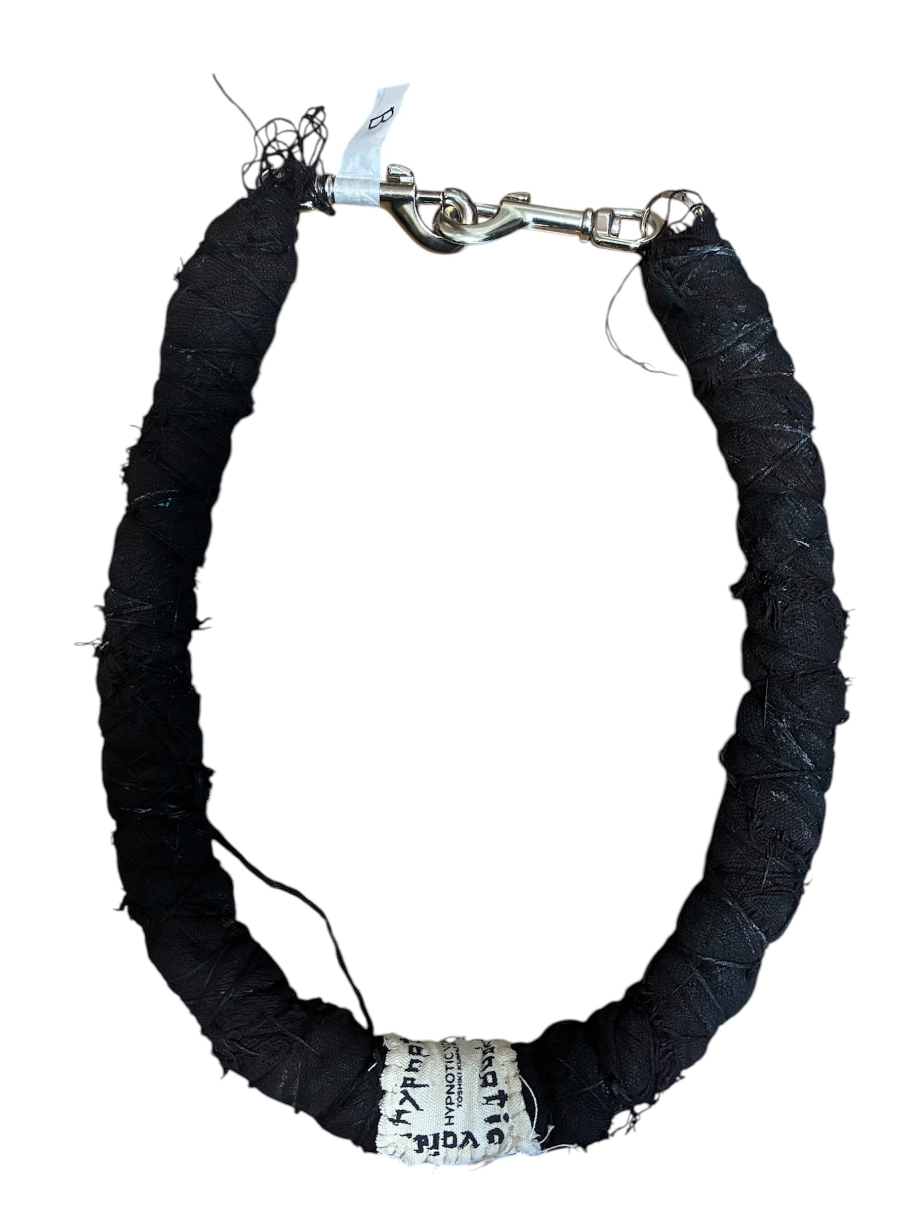 トライバルコットンを鎖に編み込み、その後黒染め加工を施しております。タグは手縫いです。