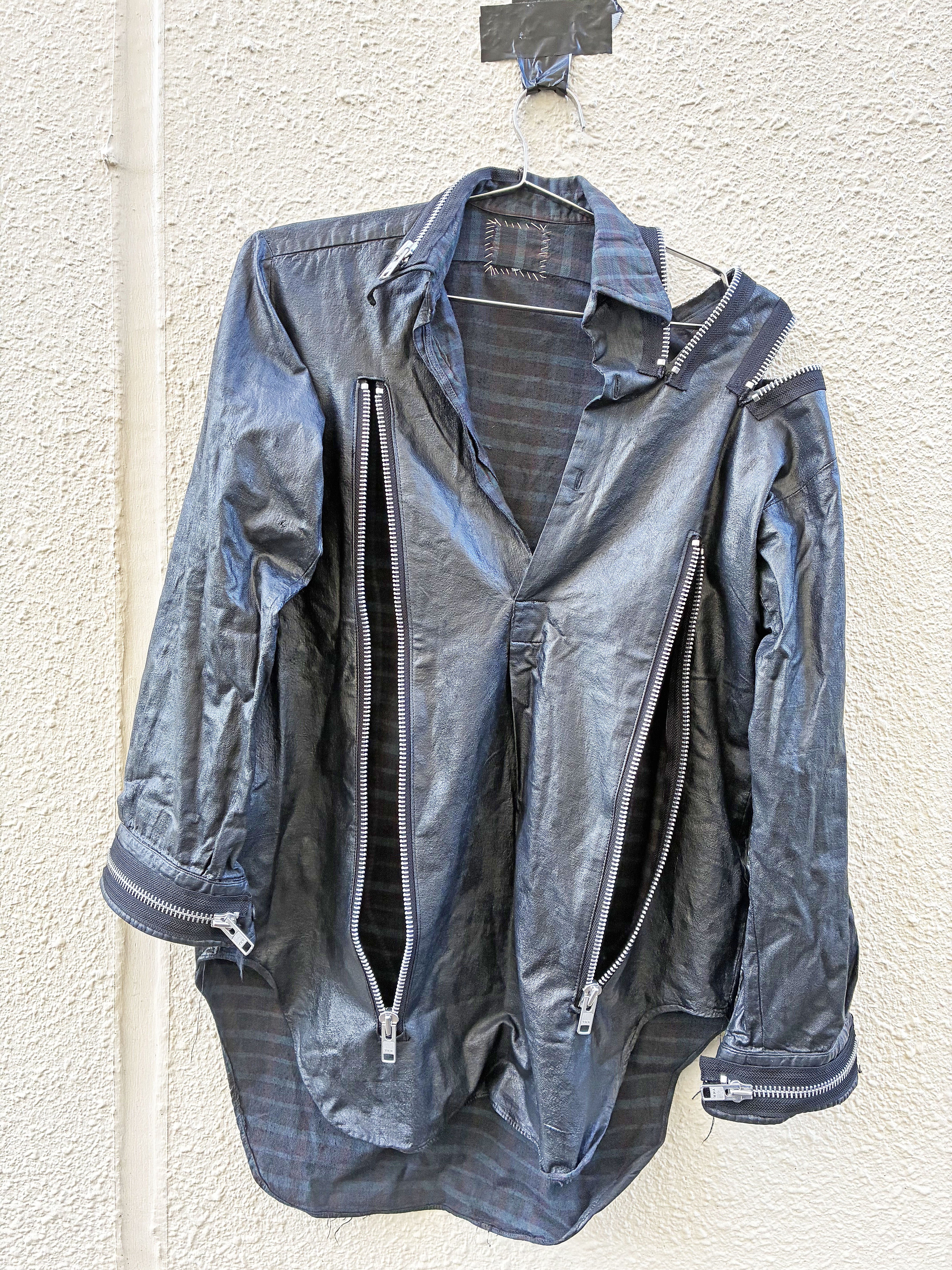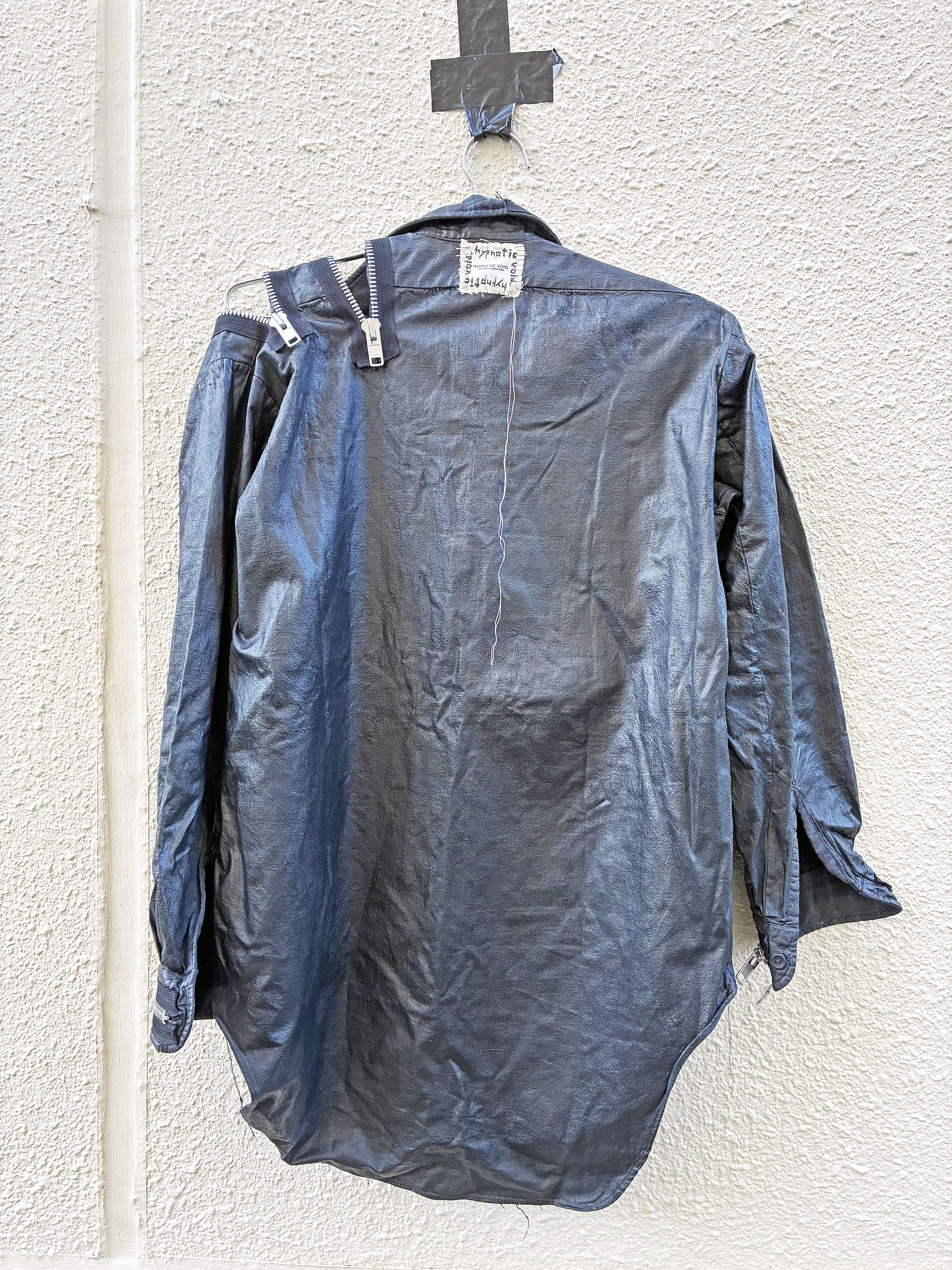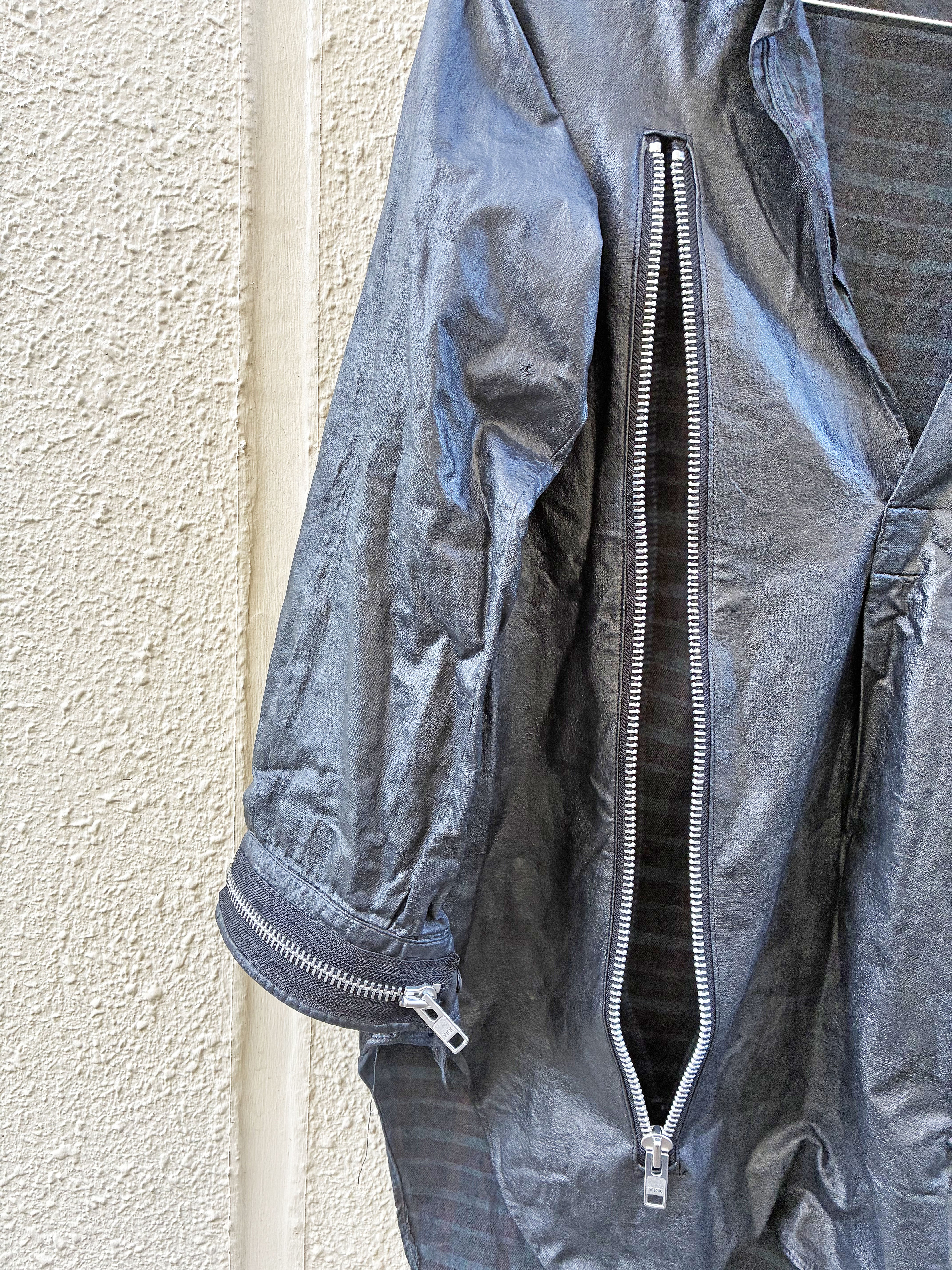 ※古着のグランパシャツを黒染めし、全面をラバーコーティング、ジップを縫い付けたリメイク商品です。