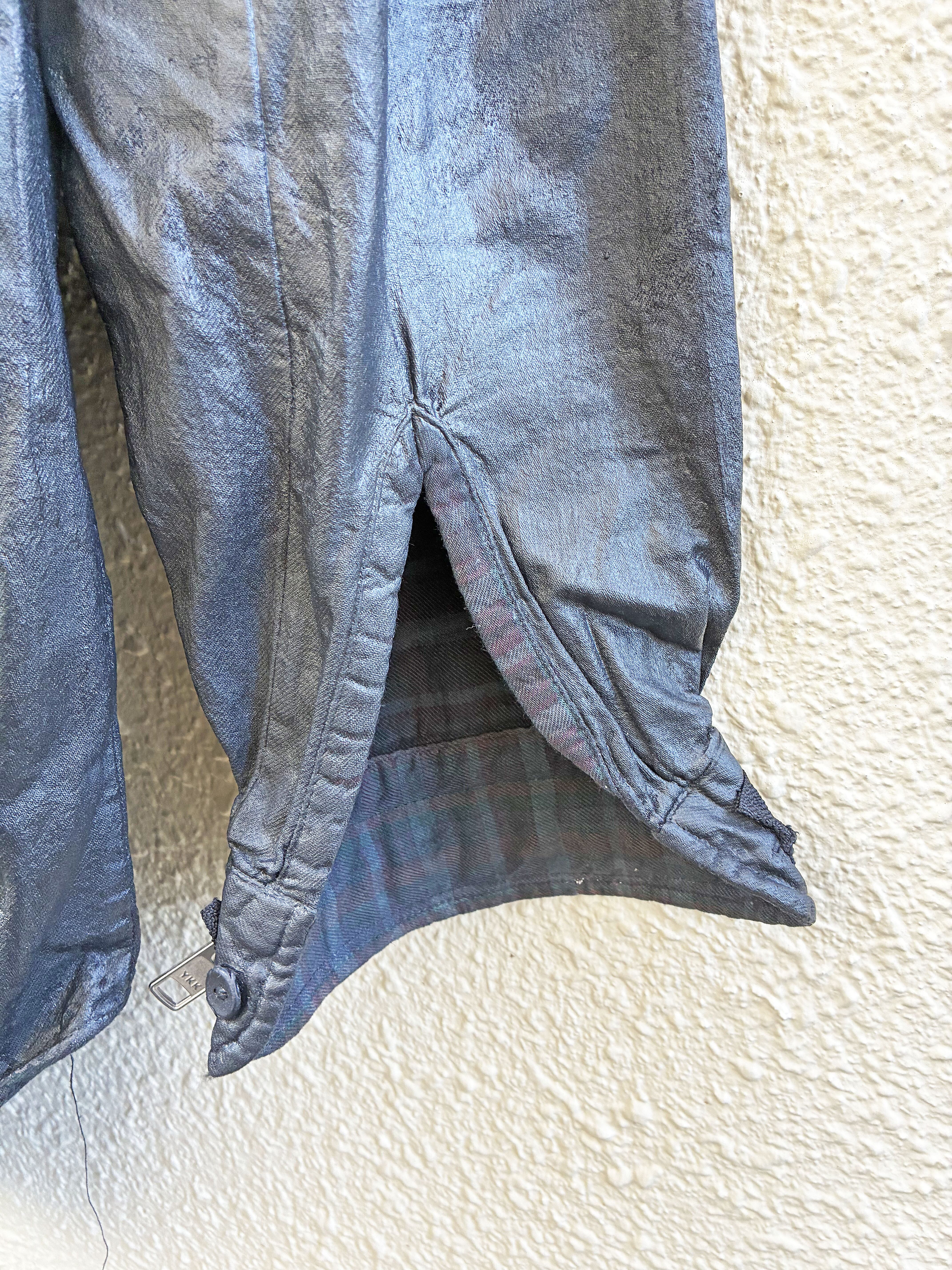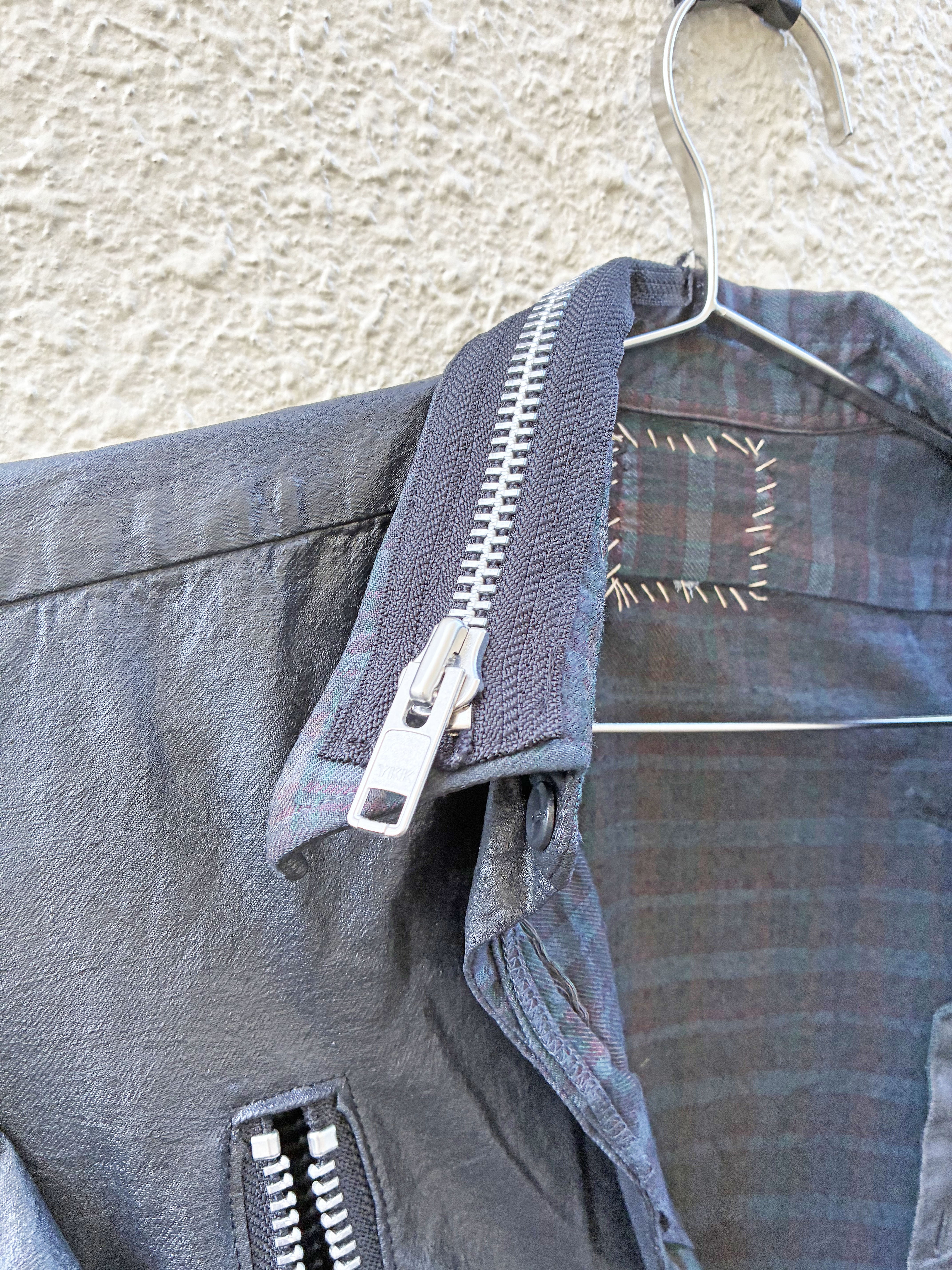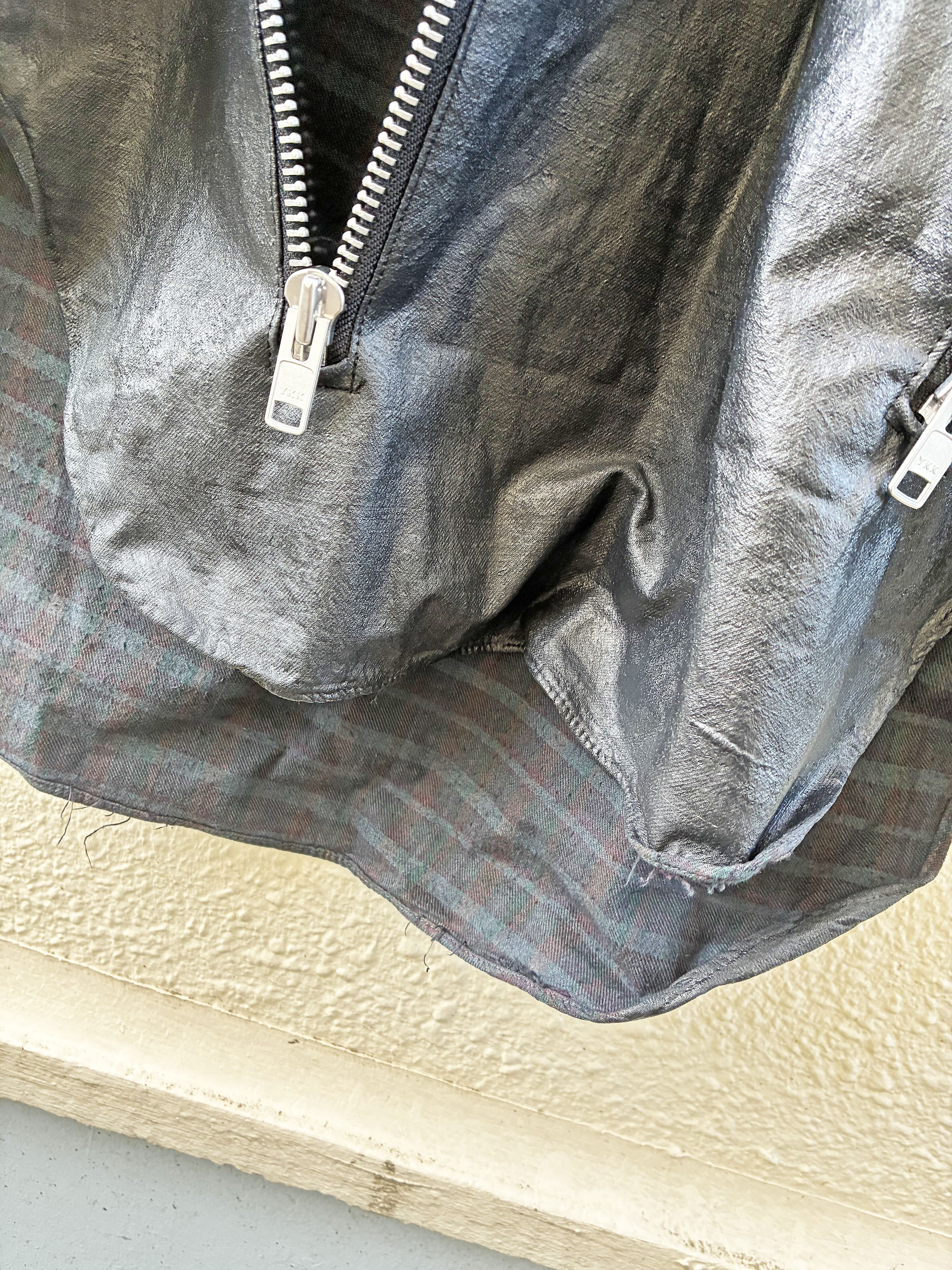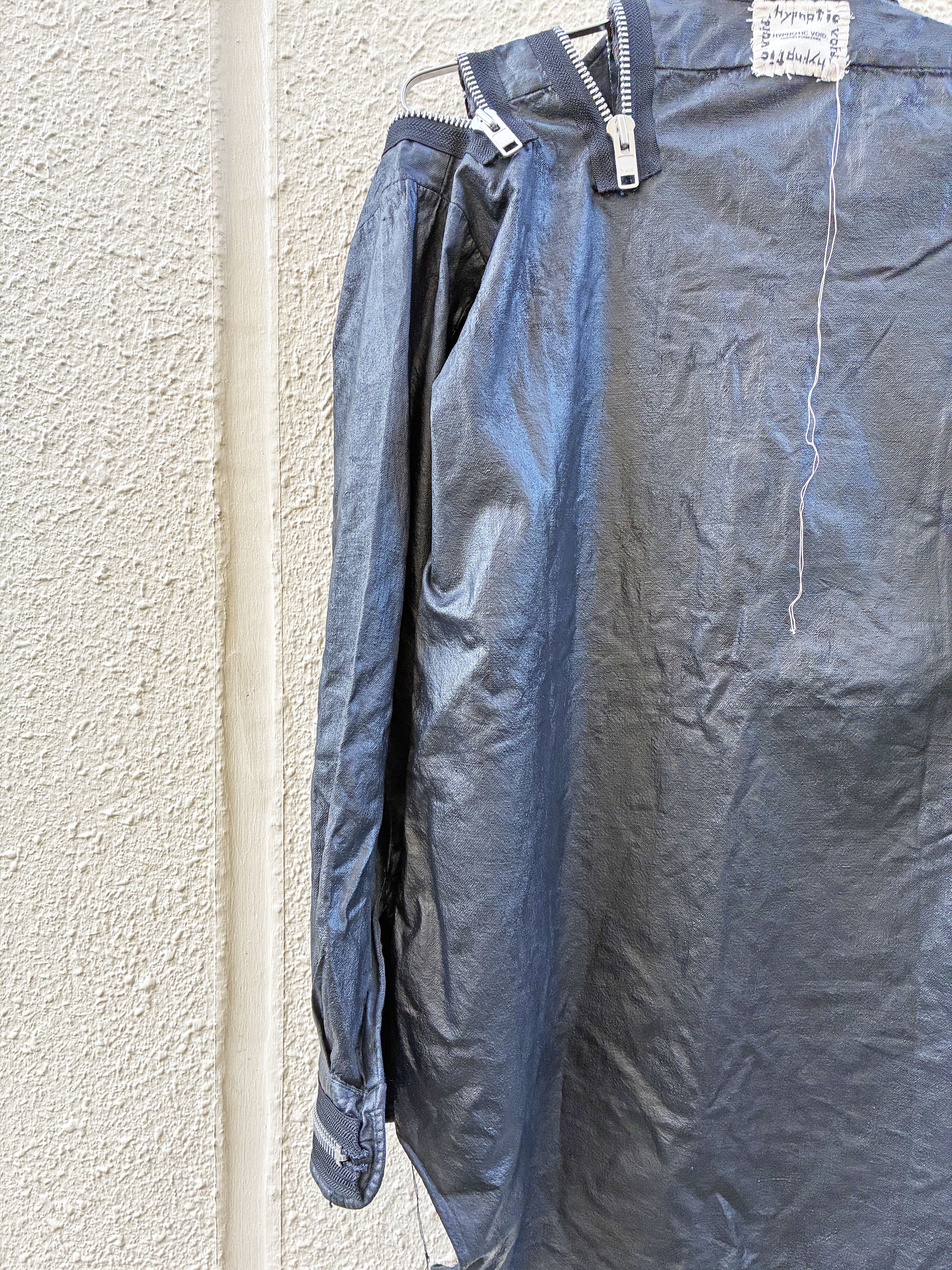 ※古着のグランパシャツを黒染めし、全面をラバーコーティング、ジップを縫い付けたリメイク商品です。